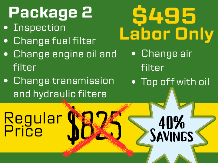 *Parts Additional on all packages. Offer ends February 27st, 2026 on customer credit for machines brought into the shop is for self-propelled/driven machines only. John Deere Financial NP/NI is for qualifying parts and services purchased between 11/1/25 and 5/31/26 and is subject to approved credit on a Multi-Use AccountTM. Payments and interest begin 11/15/26. After 11/15/26, interest charges will begin to accrue at the regular rate. For agricultural/commercial use only. See SNP rep for details.